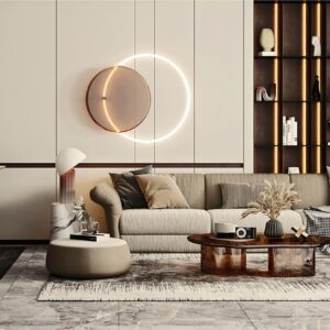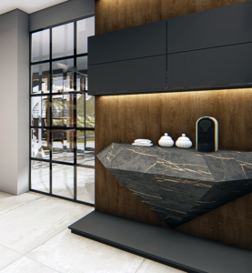 Custom diamond-shaped coffee station with engineered marble cladding and added wall cabinetry featuring a soft-close lift system